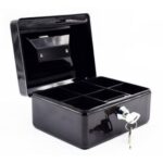 Con una excelente y resistente estructura metálica, practica manija metálica y con una espectacular bandeja plástica con 6 compartimientos para monedas, además se cuenta con un amplio compartimiento secreto al quitar la bandeja.