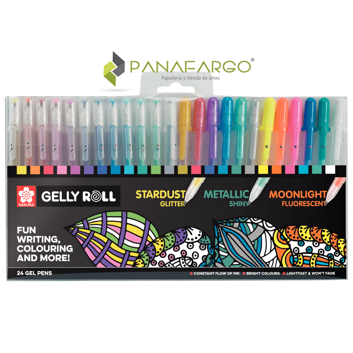 El gelly roll Sakura es un estuche que viene de diferentes tamaños. Este como tal, viene de un total de 24 unidades. Contiene 12 gelly roll Sakura escarchados, 6 metálicos y otros 6 fluorescente para completar los 24.