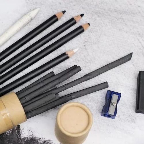 El carbón produce tonos intensos y alto contraste, tiene un acabado mate y es más oscuro que el grafito. Tanto si eres un principiante en los dibujos, como si eres un avanzado, puedes crear cualquier dibujo con carboncillo. Es fácil de borrar y mezclar, lo que permite al artista producir una variedad de efectos en una obra de arte. El carbón vegetal también se fabrica en una variedad de formas de las que te contaremos a continuación. El carbón vegetal produce marcas más suaves que se eliminan y mezclan fácilmente, mientras que el carbón comprimido produce tonos más oscuros. Muchos pintores al óleo y acrílicos eligen dibujar composiciones sobre lienzo con el carbón vegetal más suave antes de aplicar la pintura debido a su suavidad. En cambio, carbón comprimido es el más adecuado para impulsar valores más oscuros en una obra, pero es más difícil de borrar o influir con las manchas.