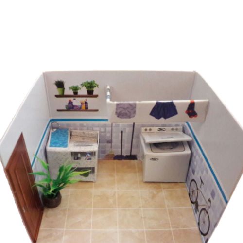 - Patio de ropa: Cuenta con una lavadora y lavadero de piedra, y en sus alrededores cuenta con múltiples decoraciones como una matera, objetos de aseo y más. Las medidas son de: 7.3 cm de ancho, 5.5 cm de largo y 5.6 cm de alto.