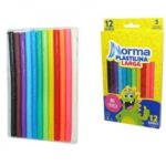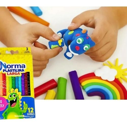 Esta plastilina norma viene en una caja de 12 unidades cada una de color diferente, los colores son: negro, café, morado, turquesa, azul, verde, verde claro, amarillo, rojo, naranja, rosado y blanco.