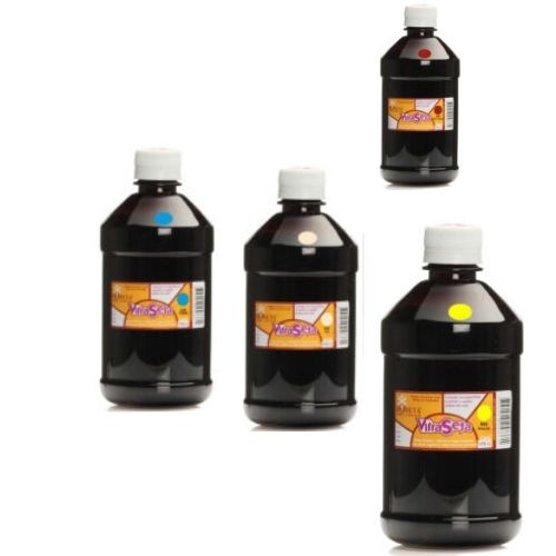 En el envase de 500 cc los colores son: negro, rojo, azul, verde, amarillo, café, blanco, dorado y plateado.